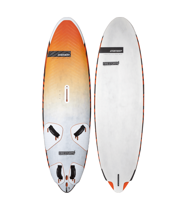 Originally designed and trimmed to combine early planning, speed, control and easy jibing, the new Firestorm V4 line has been completely re-considered not only in terms of shape and details, but mainly for its program of use. During the last 48 months since the first introduction of the Firestorm V1 Line, we have consistently kept on shaping new prototypes trying to improve the magic mix of the existing boards. But we could only improve one or two parameters, better upwind or better jibing while keeping the same top speed, but then either early planing or manouverability was being sacrificed. 48 months of development, over 25 prototype boards and over 300 hours of testing time in the water have not managed to improve the magic mix of the V1 and V2 Firestorm shapes. Then we have started to re-consider the program of use and we have understood that when you choose a new board around the program of “fast freeriding” the most important parameter is SPEED. So the whole concept of creating a 30% faster board whilst keeping early planing and control have given life to a completely new line of Firestorm boards: the VERSION 4.