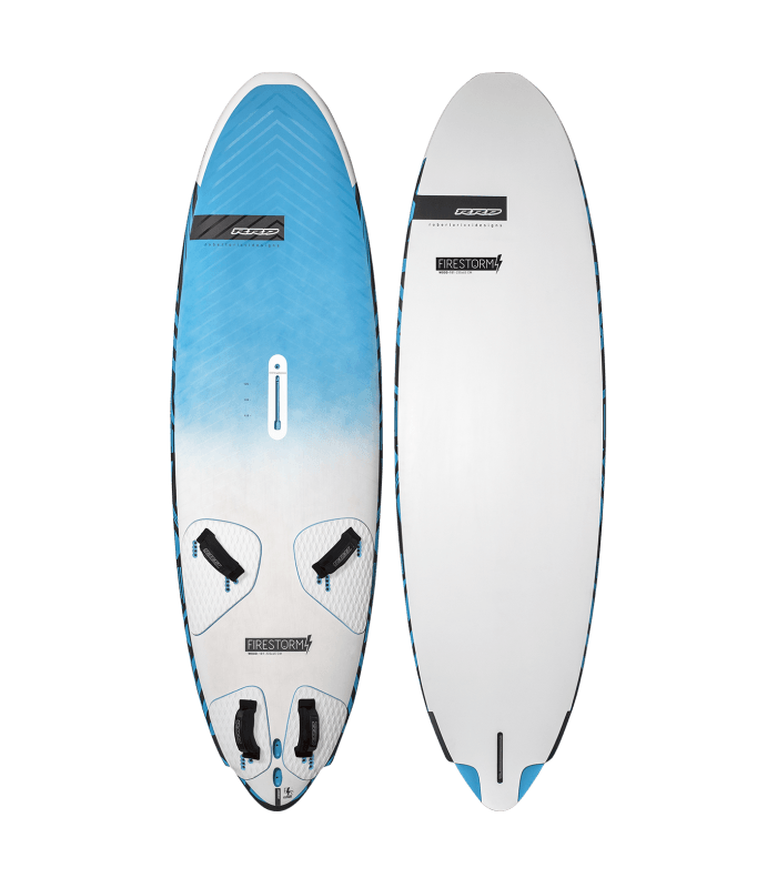 Originally designed and trimmed to combine early planning, speed, control and easy jibing, the new Firestorm V4 line has been completely re-considered not only in terms of shape and details, but mainly for its program of use. During the last 48 months since the first introduction of the Firestorm V1 Line, we have consistently kept on shaping new prototypes trying to improve the magic mix of the existing boards. But we could only improve one or two parameters, better upwind or better jibing while keeping the same top speed, but then either early planing or manouverability was being sacrificed. 48 months of development, over 25 prototype boards and over 300 hours of testing time in the water have not managed to improve the magic mix of the V1 and V2 Firestorm shapes. Then we have started to re-consider the program of use and we have understood that when you choose a new board around the program of “fast freeriding” the most important parameter is SPEED. So the whole concept of creating a 30% faster board whilst keeping early planing and control have given life to a completely new line of Firestorm boards: the VERSION 4.